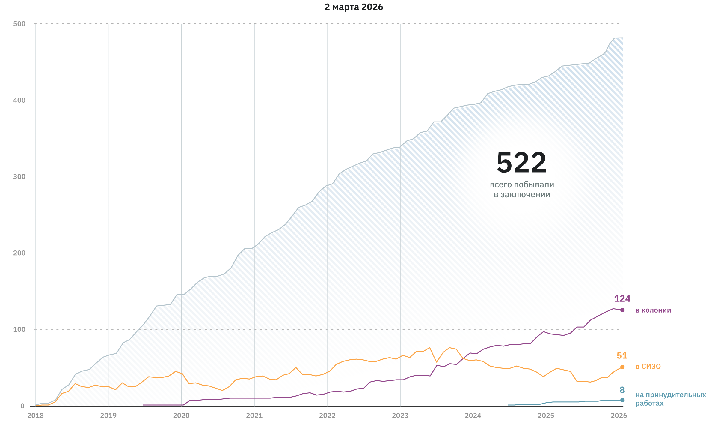 Очередная волна борьбы правоохранителей с запрещенной в России и признанной экстремистской организацией «Свидетели Иеговы» прокатилась по разным регионам. 10 февраля Абинский районный суд Краснодарского края приговорил к 7,5 годам колонии 63-летнего Александра Ившина. Столь длительный срок он получил за то, что посредством видеосвязи обсуждал со знакомыми Библию и учение иеговистов, а также исполнял религиозные песнопения. В эти же дни задержаны и обвинены в участии в экстремистской деятельности верующие в Москве, Биробиджане, Кызыле. Всего с 2017 года, когда организация была признана экстремистской и запрещена на территории РФ, преследованиям, в том числе уголовным, по данным правозащитников, подверглось более 220 человек.