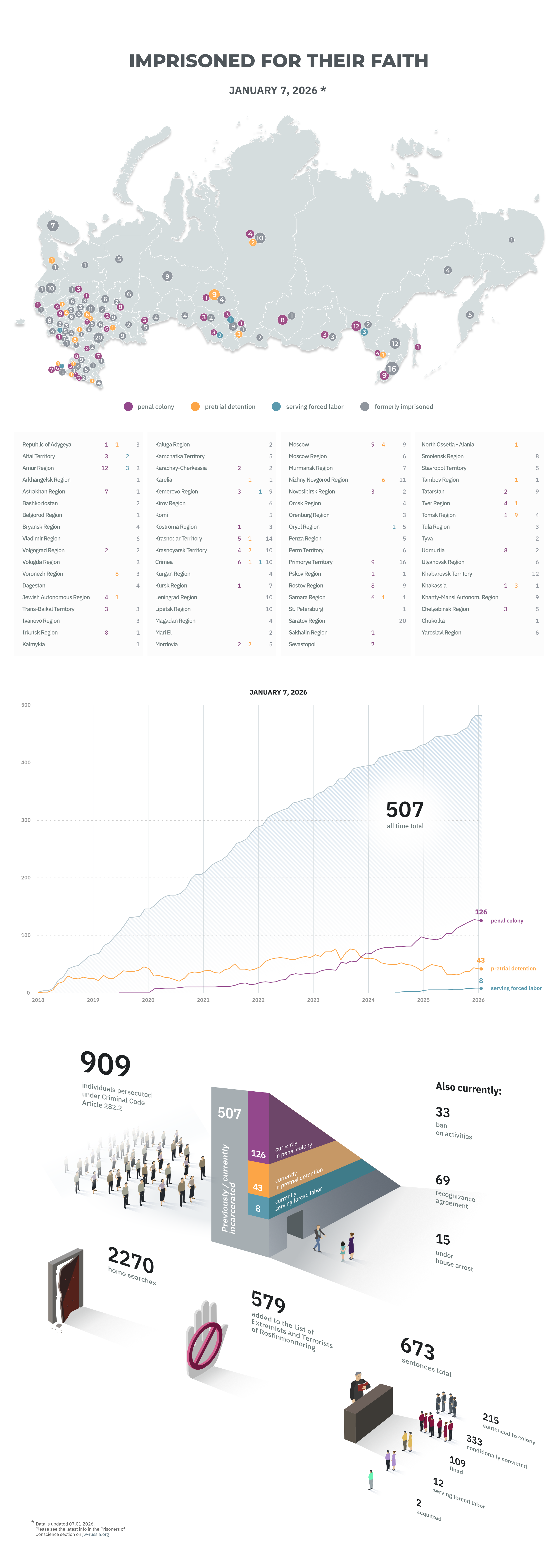 Courts continue to send Jehovah’s Witnesses to prison, and the sentence of three of them has set a new record for severity. There have been cases of violence and torture, the proportion of the elderly among the “prisoners of conscience” has increased, there are people with severe disabilities, one of whom died shortly after the verdict; the trend of prosecuting entire families continues.