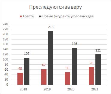Combien de personnes ont été réprimées pour leur foi en 2021 ? Au 31 décembre 2021, 597 adeptes de la religion des Témoins de Jéhovah avaient officiellement le statut d’accusés, de suspects, d’inculpés, de condamnés ou d’acquittés. Parmi eux, 142 ont été informés des poursuites pénales en 2021. (En 2019, ce chiffre était de 213 et en 2020 de 146.) Le nombre total d’affaires pénales a atteint 277 (le plus souvent 2 accusés ou plus dans une affaire pénale).