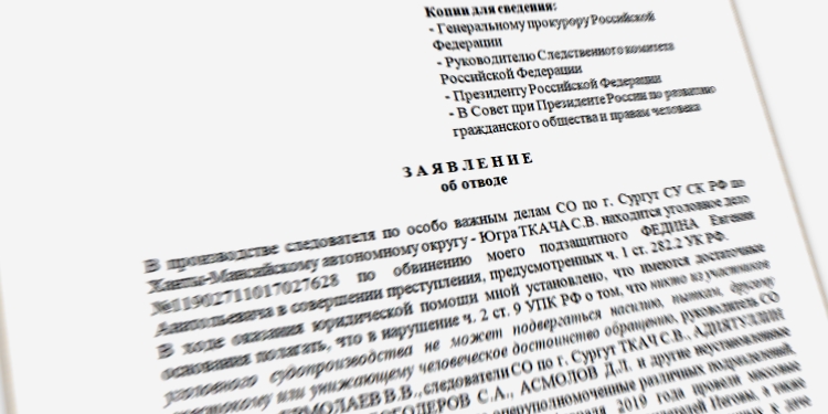 Area autonoma di Khanty-MansiIl 20 febbraio 2019 è stata presentata una domanda all'Ufficio del Comitato investigativo della Russia per l'Okrug-Yugra autonomo di Khanty-Mansi per squalificare la squadra investigativa a causa di motivi sufficienti per ritenere che il capo del dipartimento investigativo per la città di Surgut Ermolaev V.V., gli investigatori Tkach S.V., Adiyatullin A.F., Gaisin S.S., Bogoderov S.A., Asmolov D.L. e altri rappresentanti delle forze dell'ordine torturarono i testimoni di Geova detenuti.