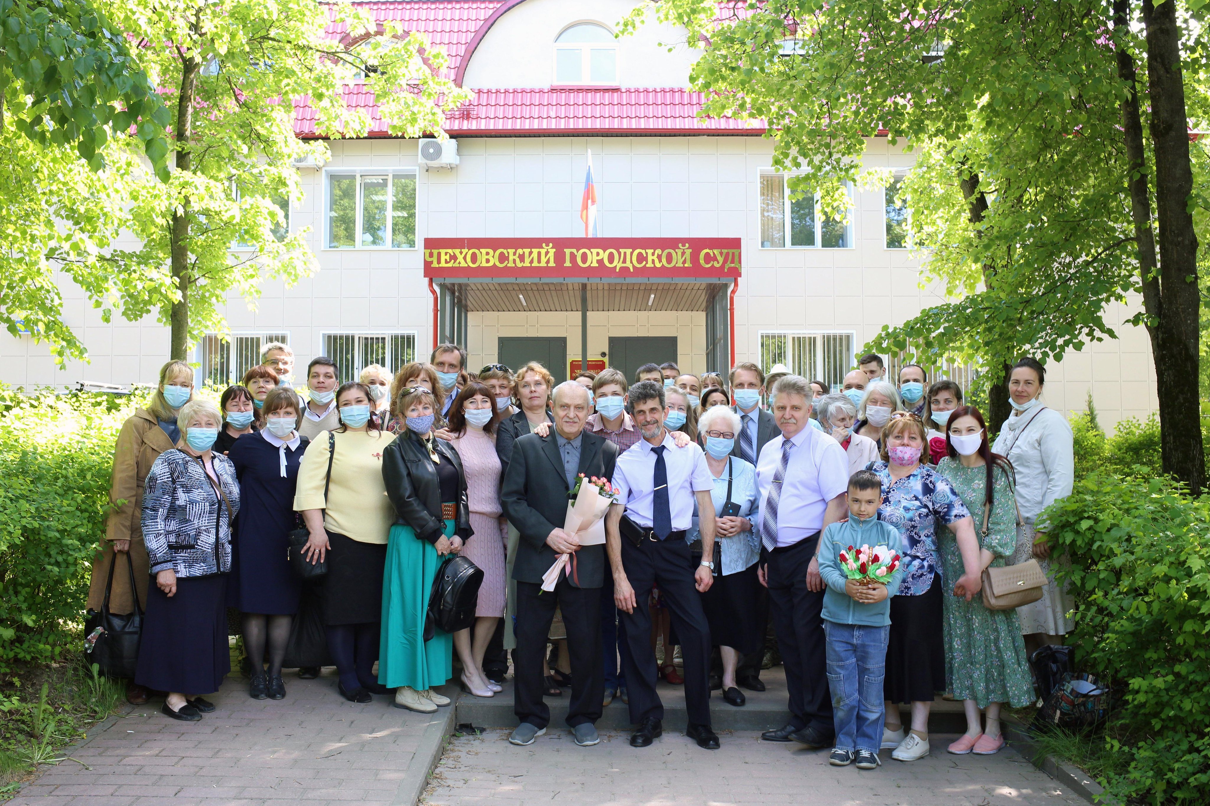 照片:2021年5月,维塔利·尼基福罗夫、尤里·克鲁蒂亚科夫和康斯坦丁·热列布佐夫在契诃夫市法院附近