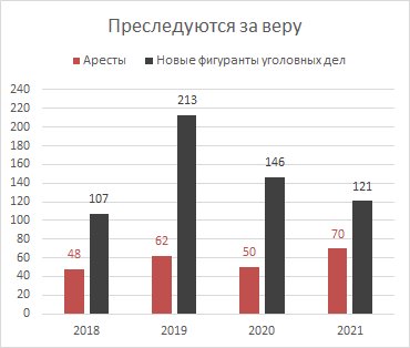 2021 年,对 54 名信徒(包括 6 名女性)选择了拘留形式的约束措施 (SIZO),另有 28 人在临时拘留设施中度过了几天,但为他们选择了与社会隔离无关的约束措施。因此,一年内有82名信徒被监禁。(2019 年,这个数字是 84 人,2020 年是 72 人。2021年,来自萨拉托夫和克麦罗沃的六名耶和华见证人在服满刑期后获释,其中一人提前两个月获释。