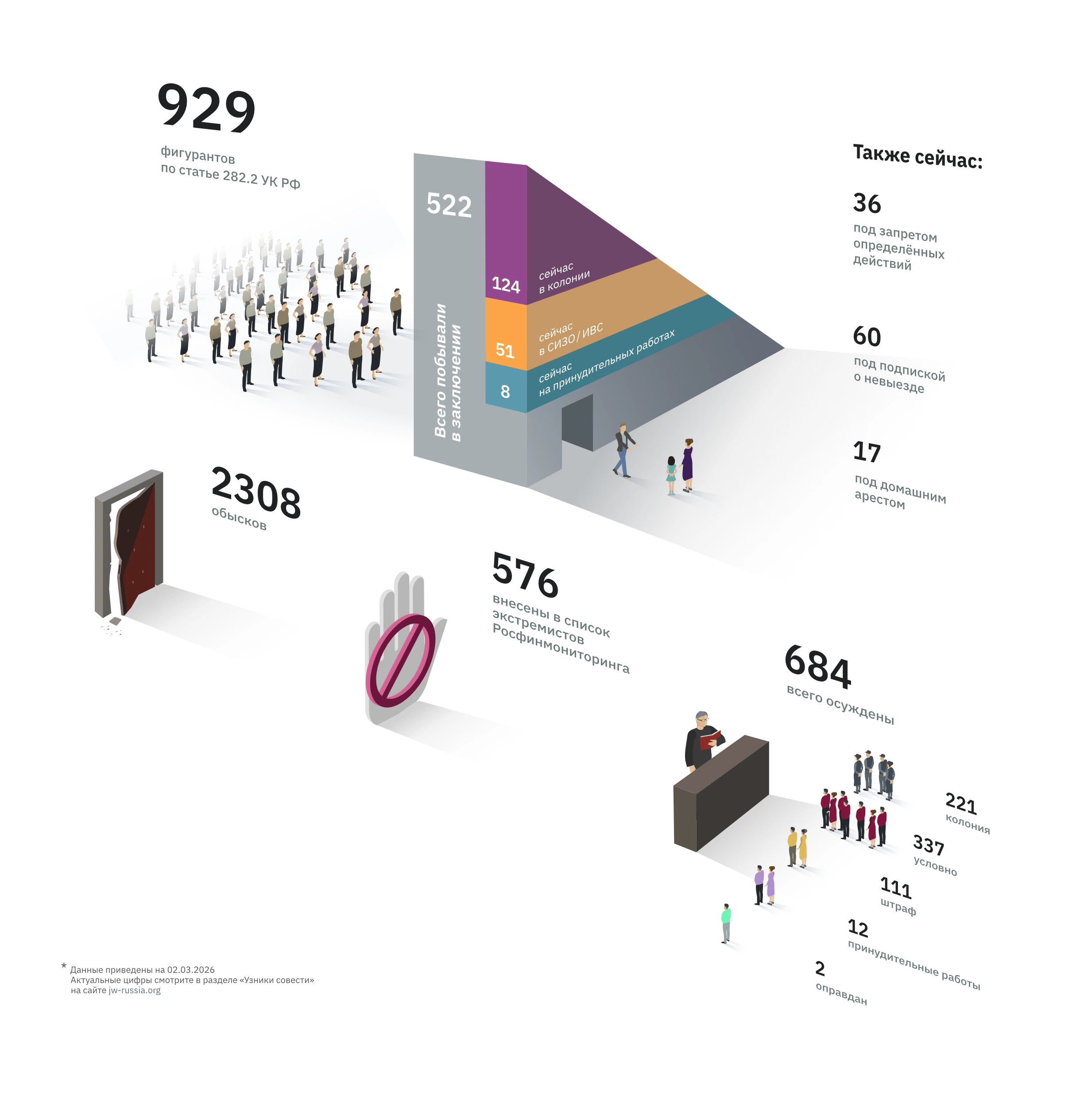 Суды продолжают отправлять Свидетелей Иеговы за решетку, а приговор троим из них обновил рекорд по жесткости. Были случаи насилия и пыток, среди «узников совести» выросла доля пожилых, есть лица с тяжелой формой инвалидности, один из них умер вскоре после приговора; сохраняется тенденция преследования целыми семьями.