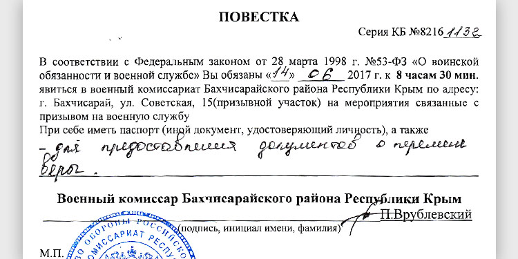 Photo: summons from the Crimean military commissariat