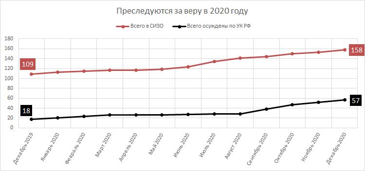 How many people were repressed for their faith in 2020? As of December 30, 2020, 427 followers of Jehovah's Witnesses are officially in the status of accused, suspected, indicted, convicted, or acquitted. Of these, 146 learned of criminal prosecution in 2020. (In 2019, the number was 213.) The total number of criminal cases brought was 188 (most often 2 or more defendants in one criminal case).