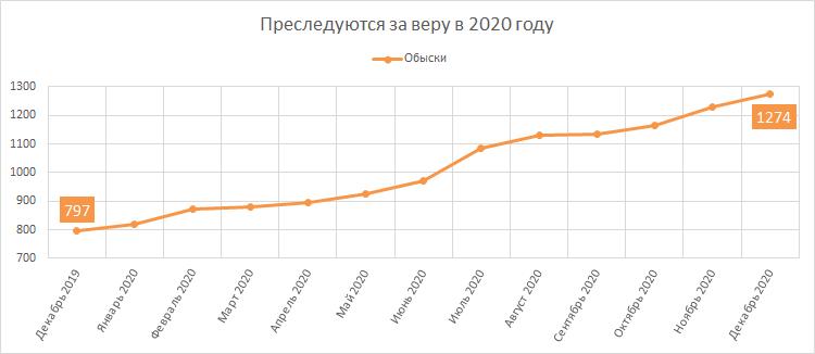 How many searches have been conducted in the homes of Jehovah's Witnesses? Since the ban on registered Jehovah's Witnesses took effect, a total of 1,274 searches have been conducted in their homes. Of these, 477 searches were conducted in 2020. (In 2019, the number was 489.) A search is a significant restriction of a person's constitutional right to liberty and security of person, privacy, personal and family secrets, honor, and good name.