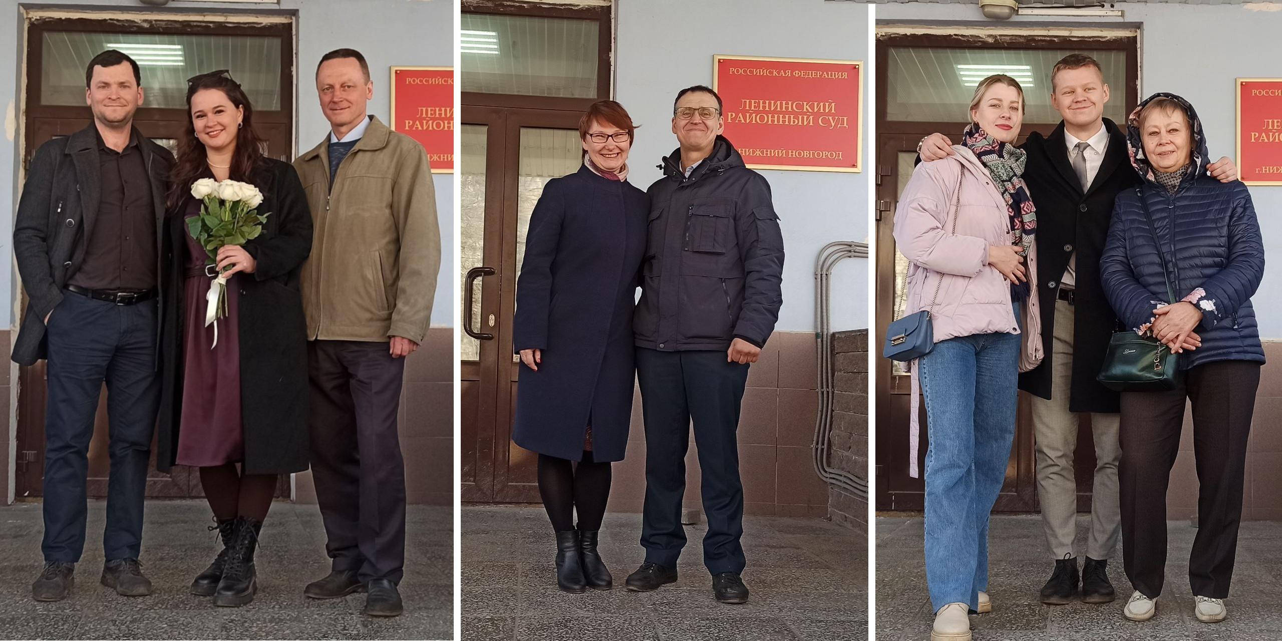 Sergey and Svetlana Malyanov, Oleg Konshin and Roman Zhivolupov with their family members at the courthouse in Nizhny Novgorod. April 2023