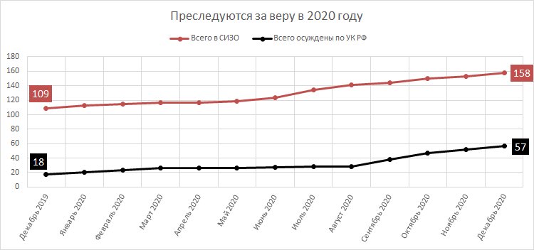 Kuinka monta Jehovan todistajaa on kulkenut väliaikaisten pidätyskeskusten, tutkintavankeuskeskusten tai rangaistussiirtoloiden läpi ja kuinka monta siellä pidetään edelleen. Yhteensä 221 uskovaa on lähetetty telkien taakse toukokuun 2017 jälkeen. Vuoden 2020 aikana 49 uskovaa asetettiin tutkintavankeuteen (SIZO) ja toiset 23 viettivät kukin muutaman päivän TDF: ssä, mutta heille annettiin pidättyvyys, joka ei ollut vapaudenmenetys. Niinpä vuoden aikana 72 uskovaa päätyi säilöön. (Vuonna 2019 luku oli 84.) 30. joulukuuta 2020 lähtien 46 ihmistä on edelleen telkien takana, joista 36 tutkintavankiloissa ja 10 rangaistussiirtoloissa.