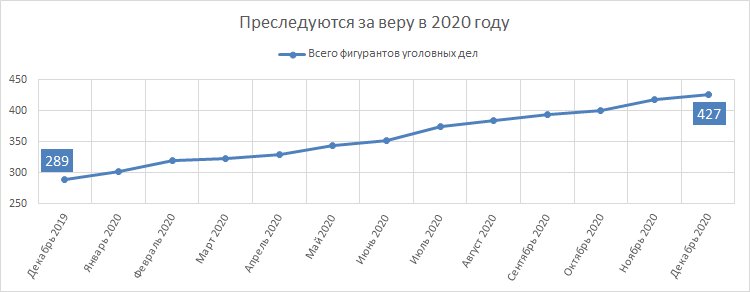 Kuinka monta ihmistä tukahdutettiin uskonsa vuoksi vuonna 2020? 30. joulukuuta 2020 lähtien 427 Jehovan todistajien seuraajaa on virallisesti syytetty, epäilty, syytetty, tuomittu tai vapautettu. Näistä 146 sai tietää rikossyytteestä vuonna 2020. (Vuonna 2019 luku oli 213.) Vireille pantujen rikosasioiden kokonaismäärä oli 188 (useimmiten 2 tai useampia vastaajia yhdessä rikosasiassa).