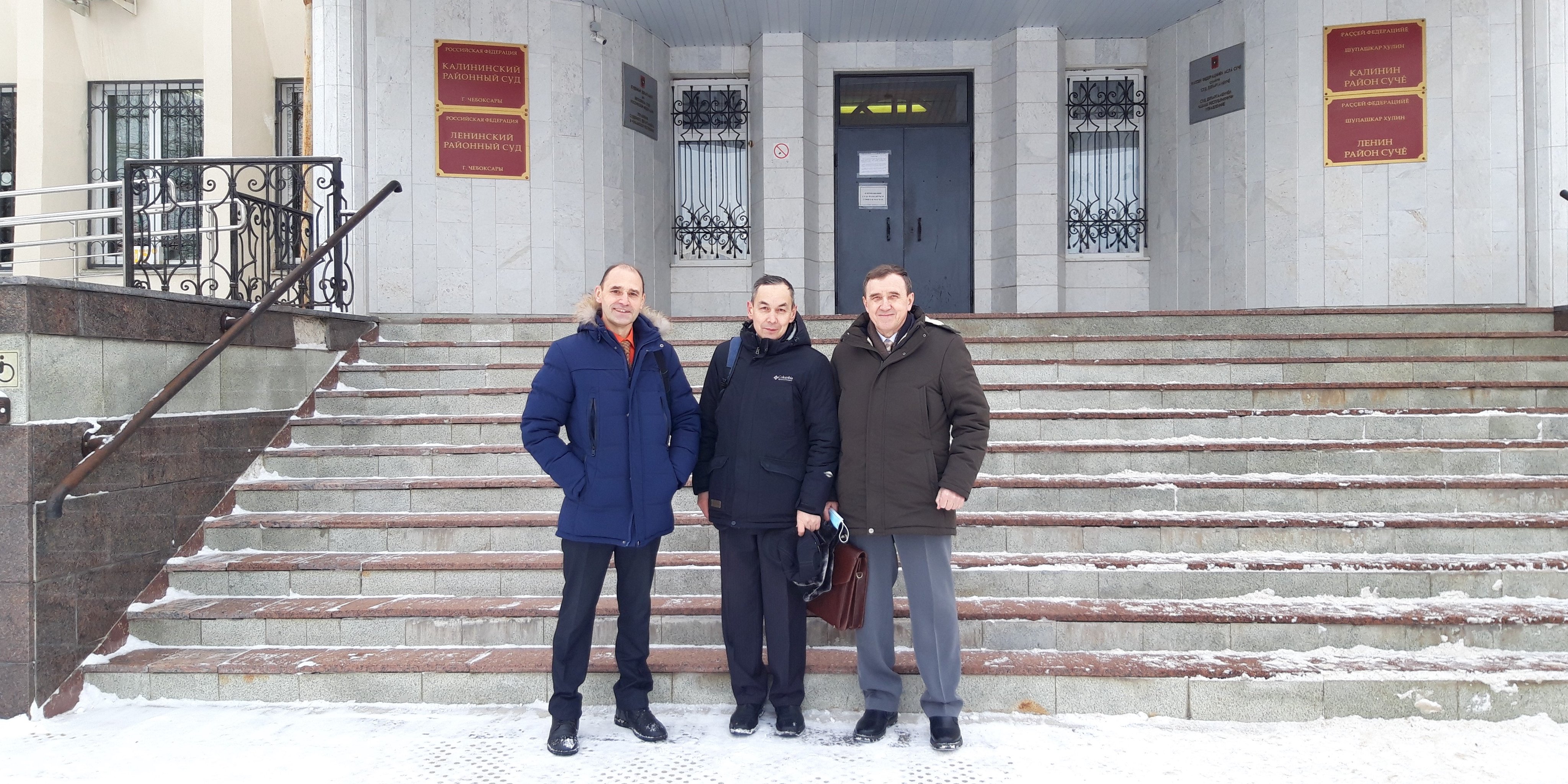 Da sinistra a destra: Vladimir Dutkin, Valeriy Yakovlev e Vladimir Chesnokov al palazzo di giustizia. Cheboksary. Febbraio 2022