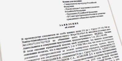 Ханты-Мансийский АО20 февраля 2019 года в Управление Следственного комитета России по ХМАО-Югре подано заявление об отводе следственной группы в связи с достаточными основаниями полагать, что руководитель следственного отдела по г. Сургут Ермолаев В.В., следователи Ткач С.В., Адиятуллин А.Ф., Гайсин С.С., Богодеров С.А., Асмолов Д.Л. и другие представители силовых органов применили пытки к задержанным Свидетелям Иеговы.