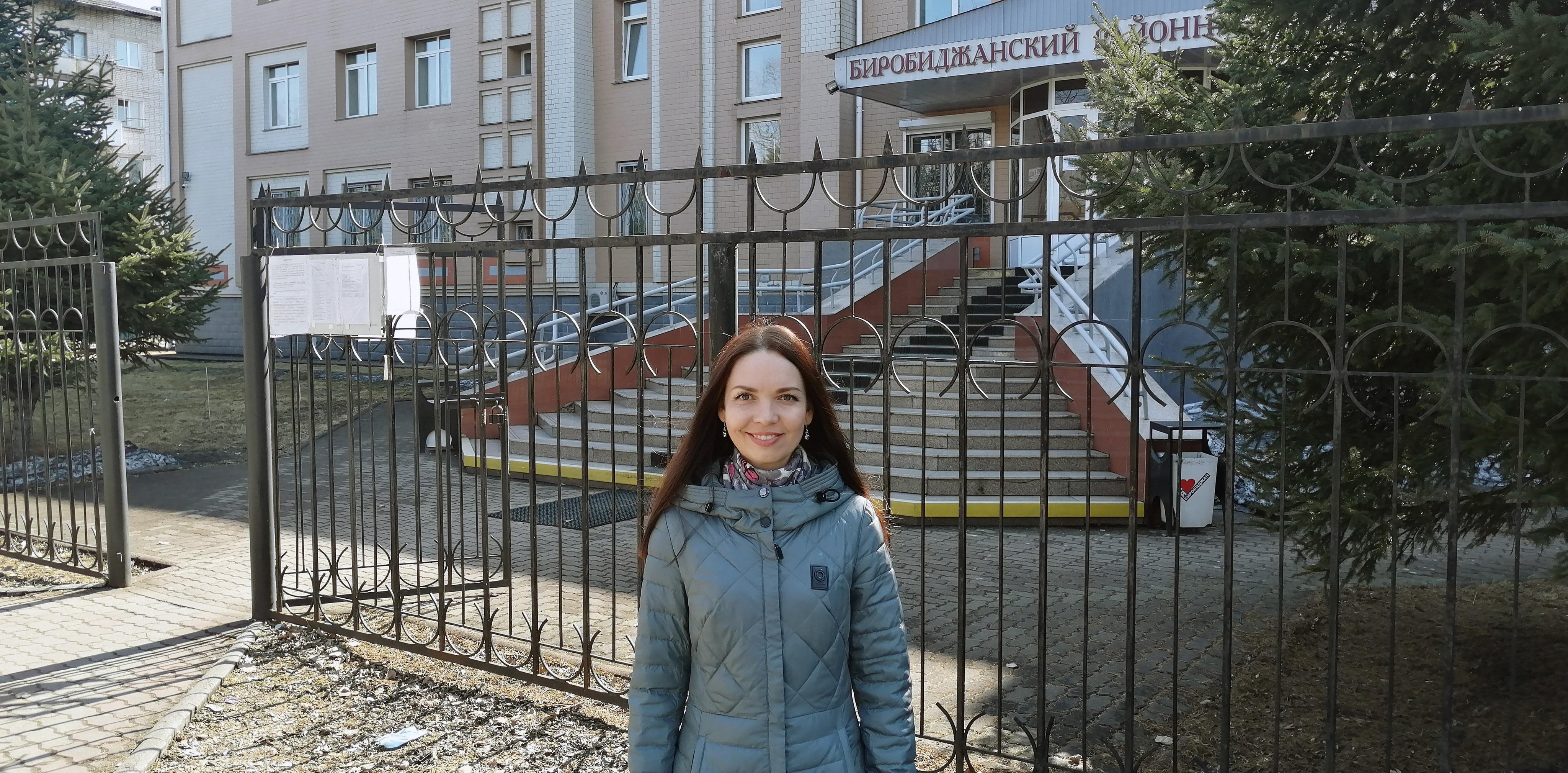 На фото: Татьяна Загулина возле здания Биробиджанского районного суда, 1 апреля 2021 года